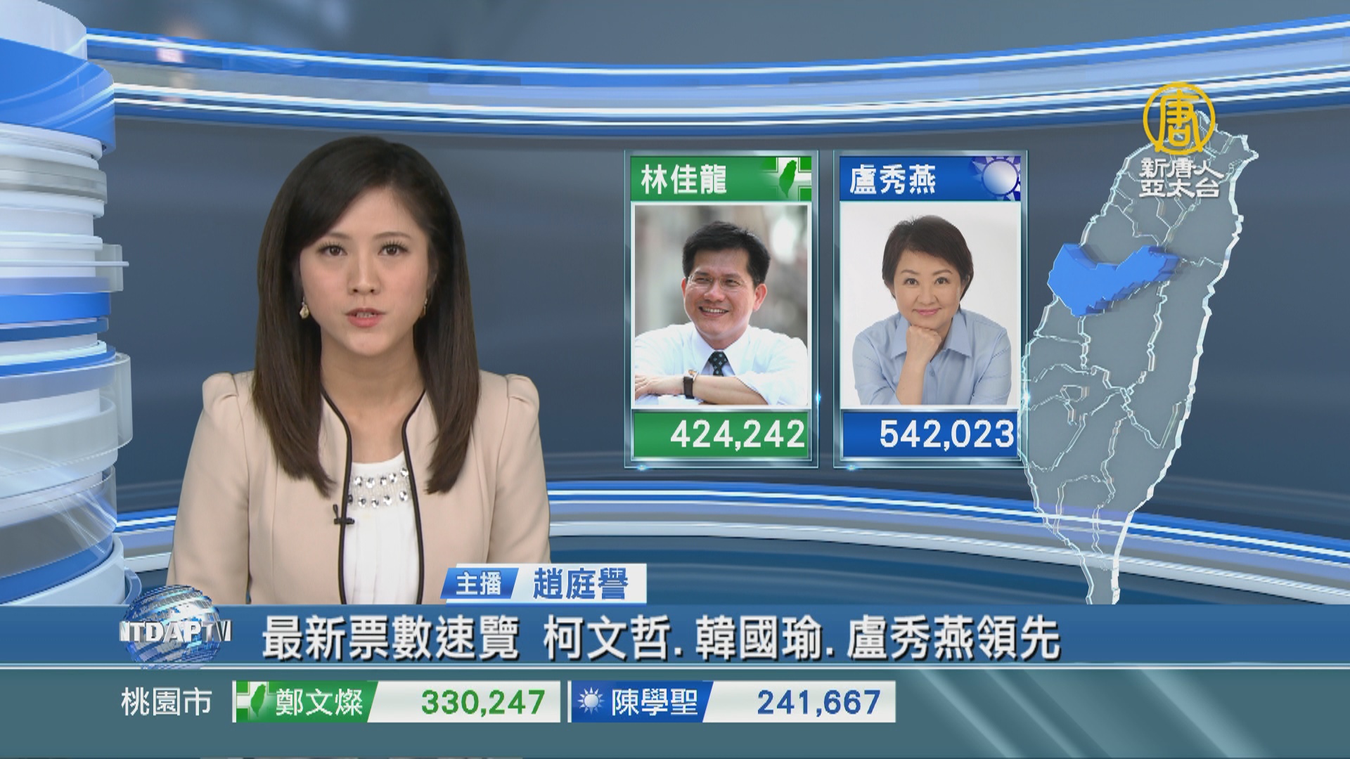 【新唐人亞太台 2018 年 11 月 24 日訊】好,趕快來看到,目前開票的最新情況,先來看到的是台北市長的部分,現任的台北市長柯文哲是微幅領先,票數來到40萬8千939票,國民黨丁守中,是緊追在後,票數來到40萬1千82票,只相差七千票左右,再來是民進黨的候選人姚文智,票數來到17萬9千993票,持續落後。|再來看到高雄市長的部分,國民黨候選人韓國瑜,票數來到44萬3千891票,目前已經超越民進黨候選人陳其邁的41萬9千633票。|再來看到台中的部分,現任市長,民進黨候選人林佳龍,票數來到了42萬4千242票,落後國民黨盧秀燕,現在盧秀燕的票數是:54萬2千23票。