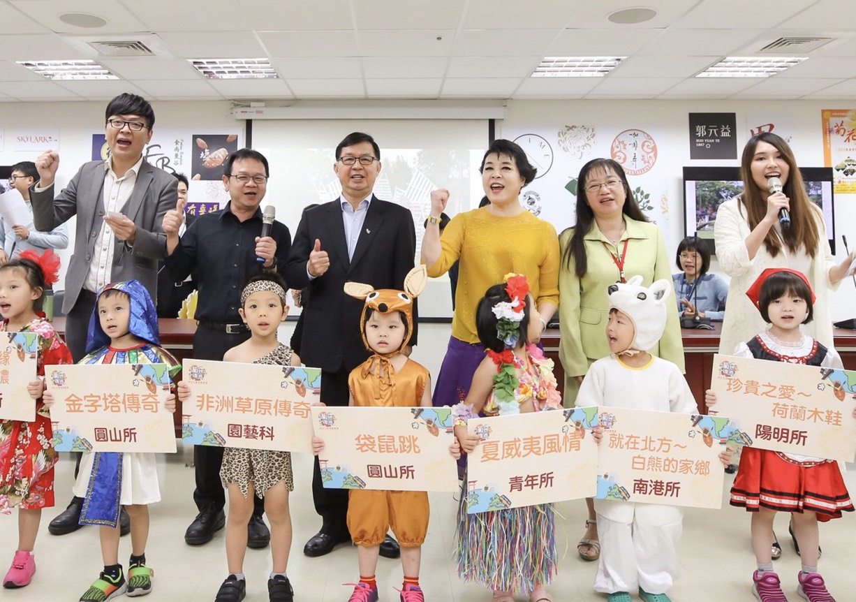 工務局彭振聲局長(後左三)與聲樂家簡文秀(後右三)以及各國造型小朋友 共同為菊展揭開序幕(億光文化基金會提供)