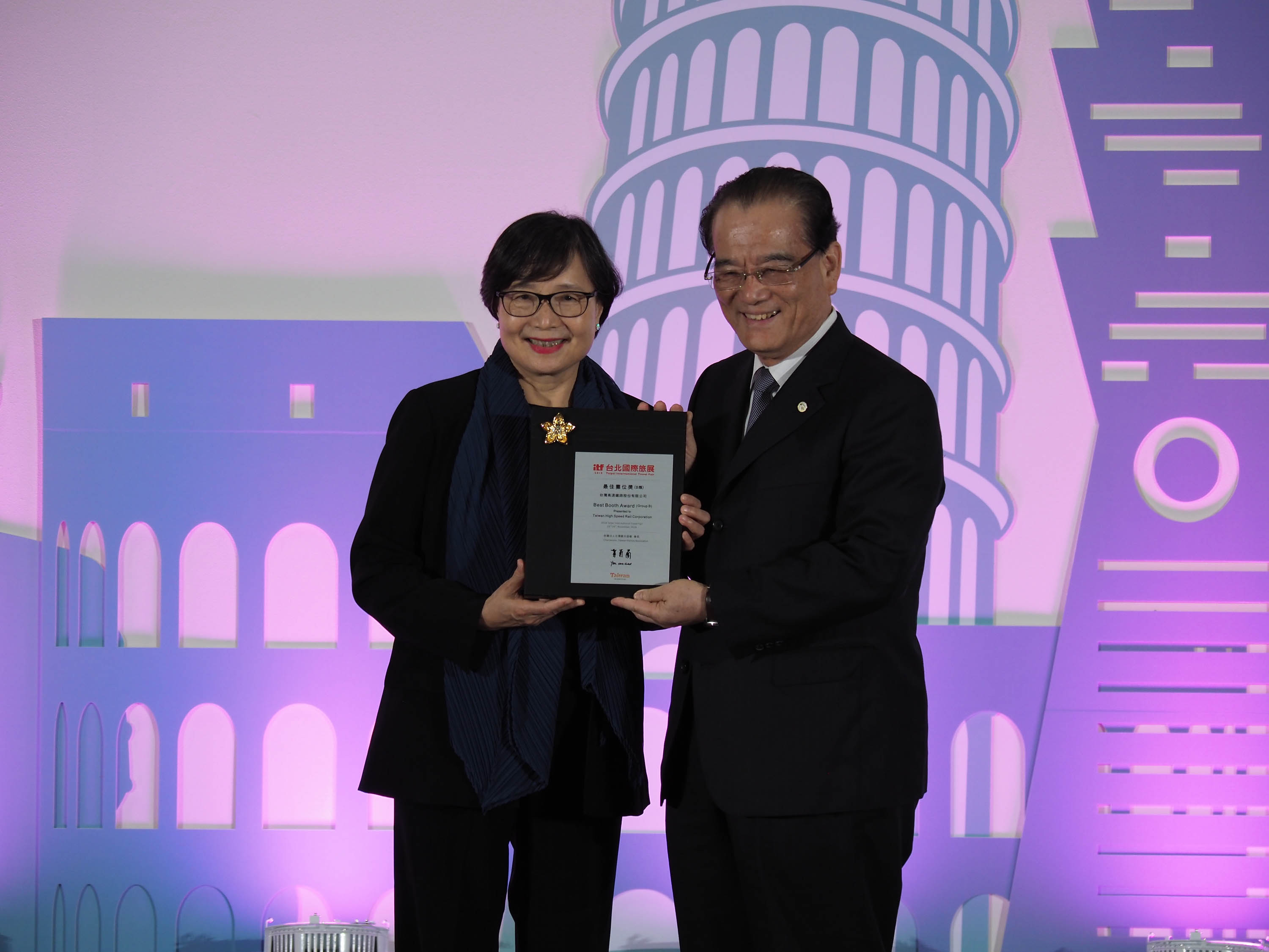 台灣高鐵榮獲2018台北國際旅展「最佳攤位獎」,由台灣觀光協會葉菊蘭會長(左)頒獎給台灣高鐵總經理鄭光遠(右)。(圖/台灣高鐵提供)