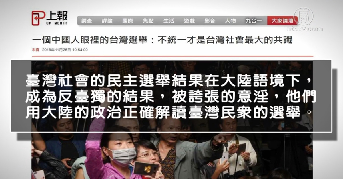 一位來自中國的自由撰稿人「末夏」在臺灣《上報》發表評論文章說,這本來是一樁臺灣社會的民主選舉,放到大陸語境下,變成反臺獨的結果,這是被「誇張的意淫」,用大陸的政治正確解讀臺灣民眾的選舉。