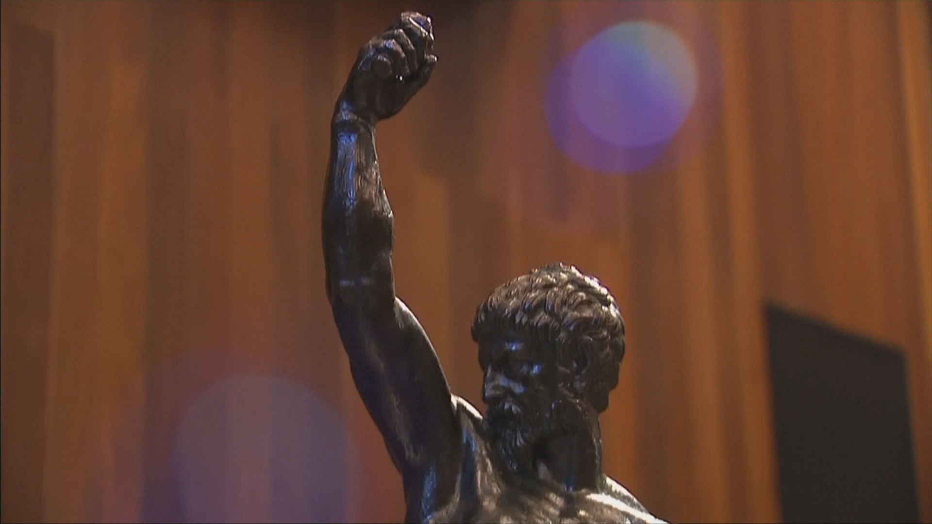 【新唐人亞太台 2018 年 11 月 29 日訊】兩件青銅雕像,各有一名肌肉線條優美的男子騎著獵豹,並高舉勝利手勢,這兩件作品的人體結構非常精準,而且有著米開朗基羅的創作特點,經過各方專家學者鑑定,確定是大師真跡,這也是米開朗基羅在世上僅存的兩座青銅像作品,