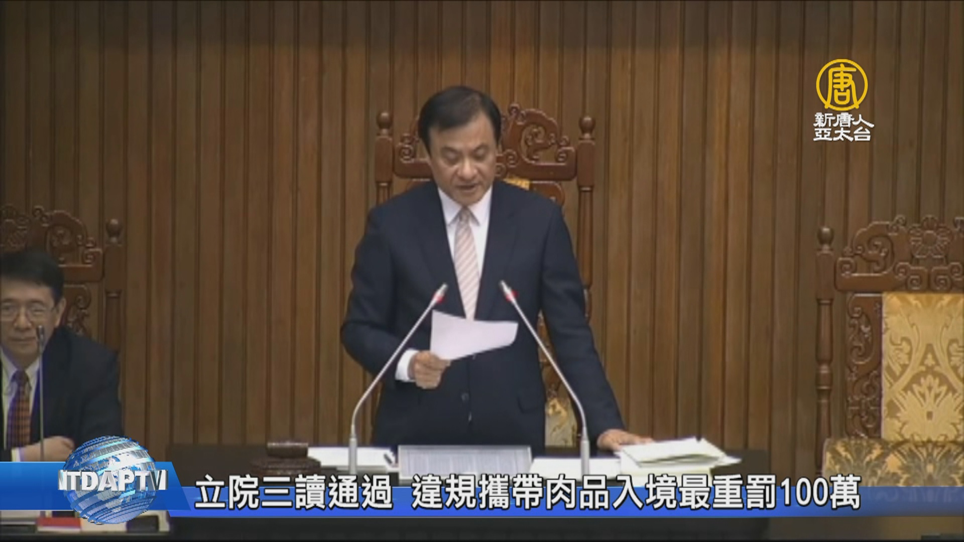 【新唐人亞太台 2018 年 11 月 30 日訊】非洲豬瘟疫情蔓延全中國,台灣政府雖然全力防堵,但仍不時查獲有民眾私自夾帶中國豬肉製品回台,立法院今天三讀通過《動物傳染病防治條例》修正案,未來如果有旅客違規攜帶疫區肉品入境,將可處以1萬到100萬元新台幣罰鍰。