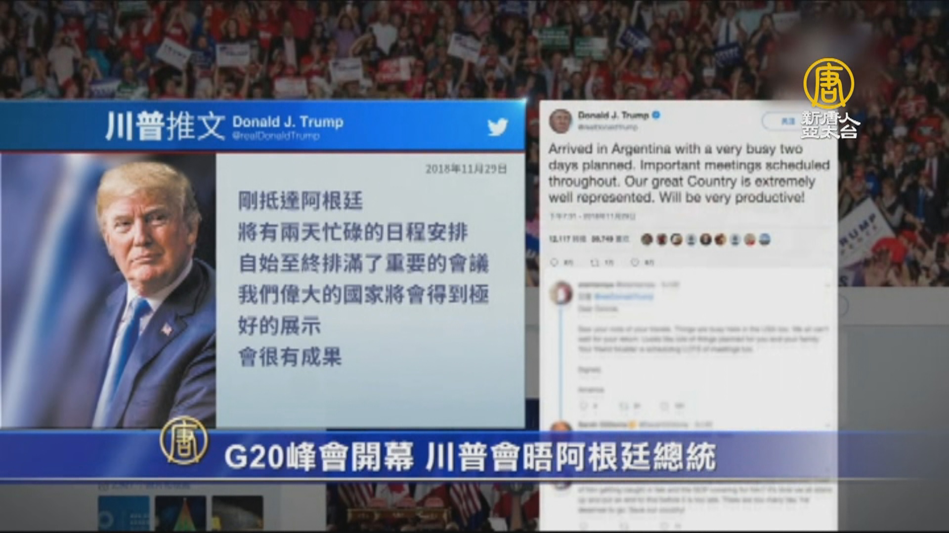 川普著陸後發推文說,「剛抵達阿根廷,將有兩天忙碌的日程安排,自始至終排滿了重要的會議。我們偉大的國家將會得到極好的展示,會很有成果!」