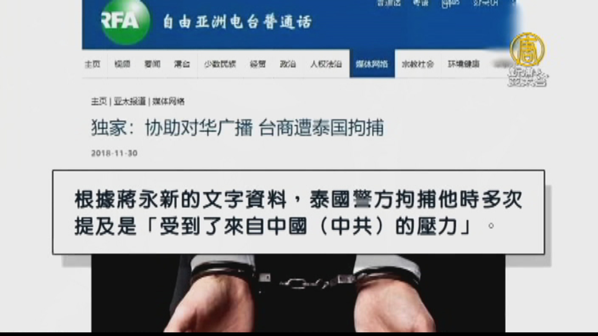 【新唐人亞太台 2018 年 12 月 03 日訊】近日,臺灣商人蔣永新因在泰國清邁代租了一間用於「希望之聲廣播電臺」對華廣播的辦公室,而遭到泰國警方抓捕。希望之聲總負責人曾勇表示,中共對希望之聲的廣播非常害怕,一直在施壓周邊國家,進行干擾,也呼籲當局,不要再限制蔣永新的自由。