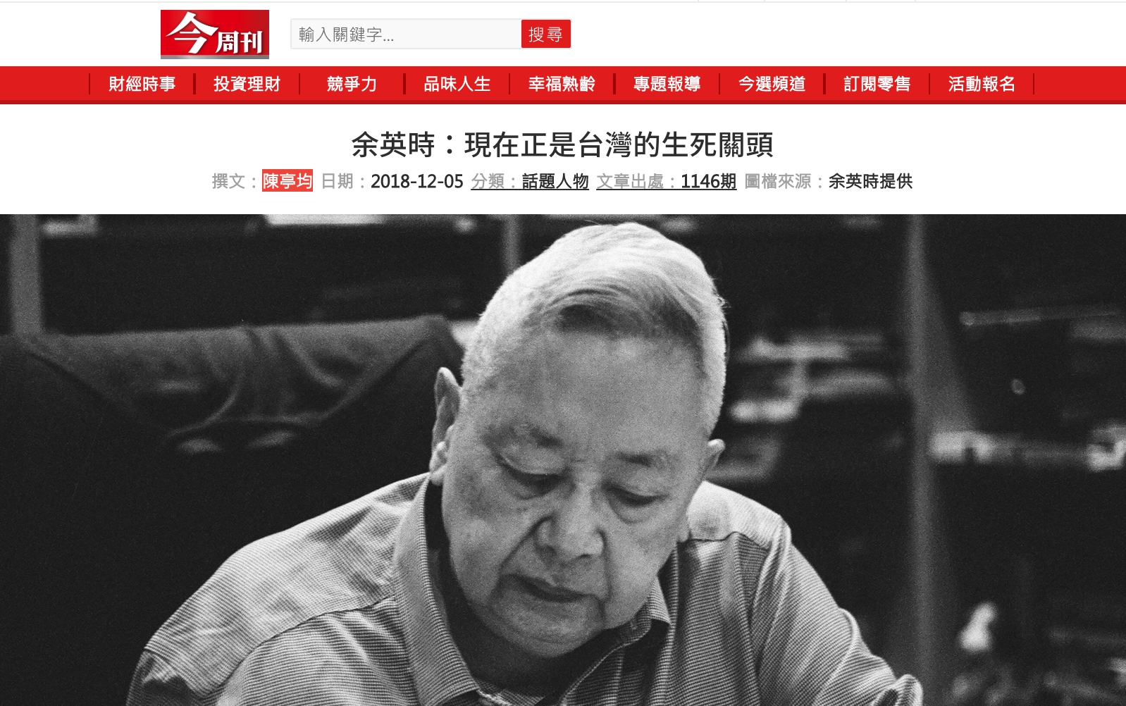 台媒《今周刊》 12月5日刊登史學家余英時的長篇專訪〈余英時:現在正是台灣的生死關頭〉,電話訪問時間在台灣11月24日九合一大選前些天。