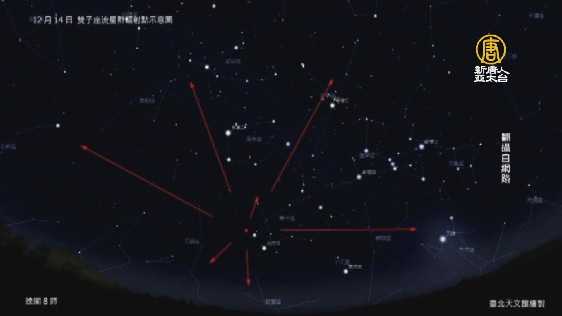 【新唐人亞太台 2018 年 12 月 14 日訊】觀眾朋友今晚可以試著抬頭,看看全年最大的流星雨。氣象局表示,年度三大流星雨之一的雙子座流星雨,今晚八點半大爆發,每小時約120顆,是全年流星雨之冠。台北天文館說,最適合觀察的時段,是在今天的晚上11點到天亮前,只要選擇無光害、視野開闊的空曠郊區,用肉眼就能盡情觀賞這場壓軸流星雨。