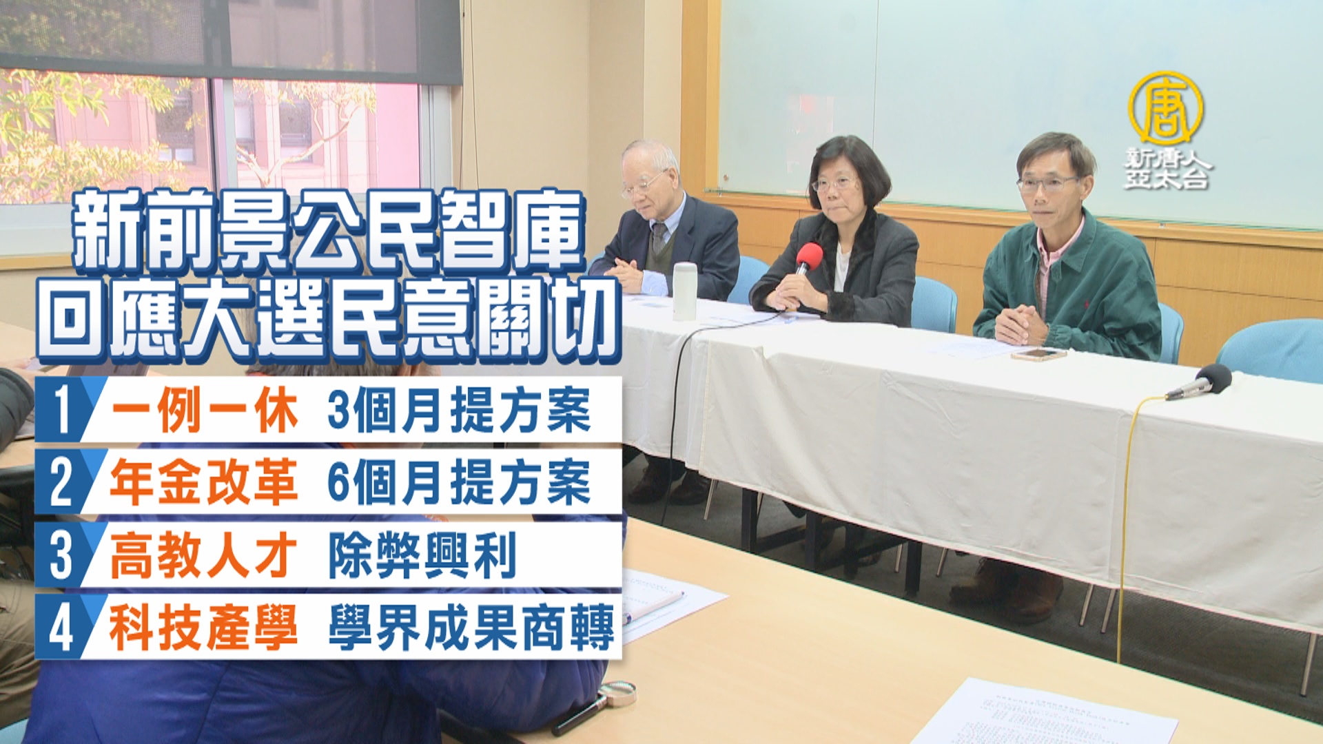 【新唐人亞太台 2018 年 12 月 17 日訊】為了回應民眾在大選期間,關注的經濟議題,台大機械系、經濟系、醫學系等多位學者,周一(17日)成立新前景公民智庫,顧問群包括兩位中研院士。不募款,學者做志工,為經濟、年金改革及一例一休找出路。