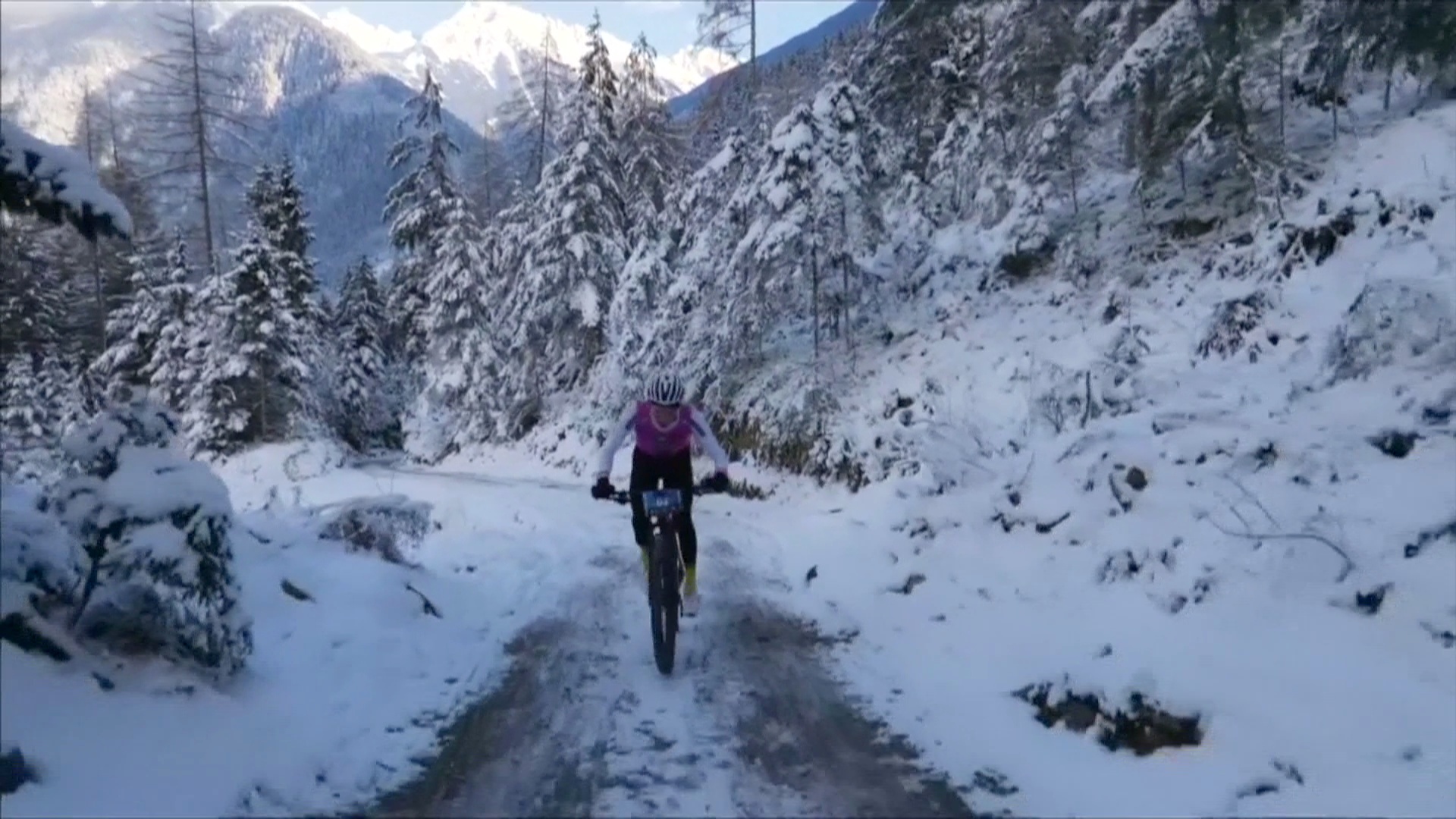 選手拖著滑翔傘奮力將接力棒傳到隊友手中。接下來要完成的是山地車騎行,選手要在雪地上騎過3.7公里的路程,而且也是上坡哦!