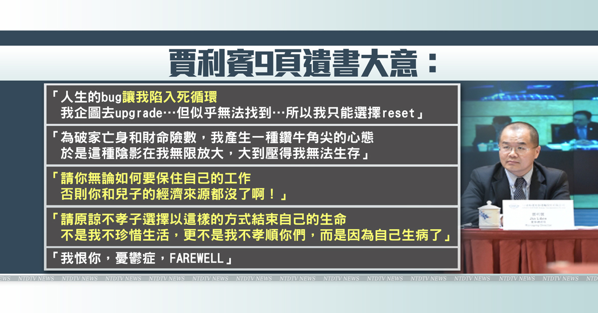 39歲的賈利賓,在遺書中提到,因為無法跳脫人生困境的死循環,加上長期憂鬱症所苦,選擇輕生,不捨妻兒,也喊話妻子要保住自己的工作,維持經濟來源,並向父母斥自己為不孝子。