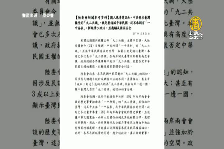 【新唐人亞太台 2018 年 12 月 25 日訊】再來看到,有媒體媒體近日公布「九二共識」支持率民調,中華民國陸委會,昨晚發布書面聲明指出,表示國人應清楚認知,中共要求台灣接受的「九二共識」,就是要消滅中華民國,從不承認有「一中各表」。各界拚經濟應少談政治,並顧及國家安全。