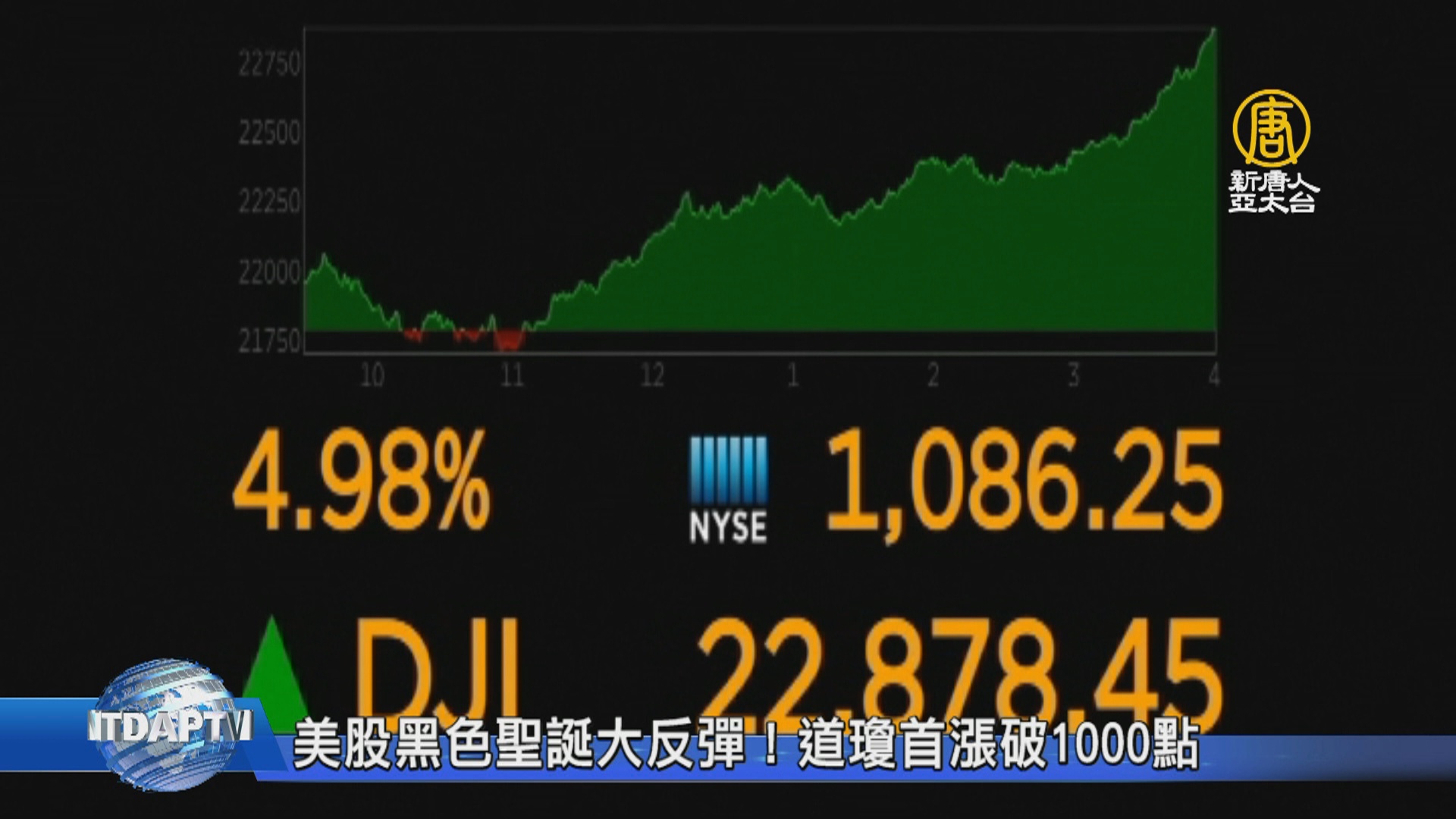 【新唐人亞太台 2018 年 12 月 27 日訊】美國股市週三強勢反彈,道瓊工業指數大漲1086.點,漲幅近5%,收在2萬2千8百多點,創下單日漲幅歷史新高,擺脫平安夜當天大跌陰影。