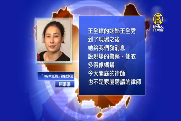 「709大抓捕」律師家屬 原姍姍:「王全璋的姊姊王全秀到了現場之後,她給我們發消息,說現場的員警、便衣,多得像螞蟻。今天開庭的律師也不是家屬聘請的律師,至於王全璋那邊有什麼具體情況,還有開庭的情況,家屬這邊是一無所知。」