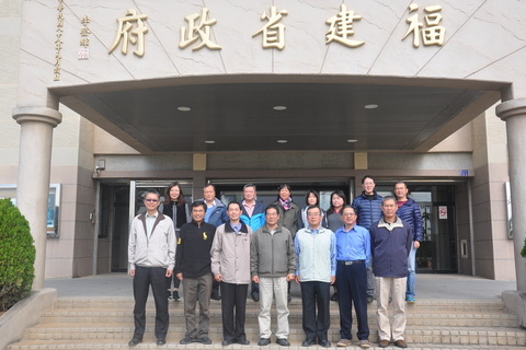 福建省政府因應去任務化,明年起不再編列預算,31日結束辦理業務,正式劃下句點,省府秘書長翁明志(前中)28日與同仁在省府大樓前留影。(福建省政府提供)