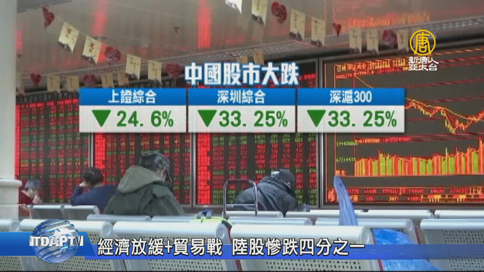 【新唐人亞太台 2019 年 01 月 02 日訊】美中貿易戰加上中國經濟放緩重挫中國股市。中國上證綜合指數年底以2493.90點封關,比前年大跌24.6%,深圳綜合指數和深滬300指數也分別下跌33.25%和25.31%,慘跌超過四分之一。