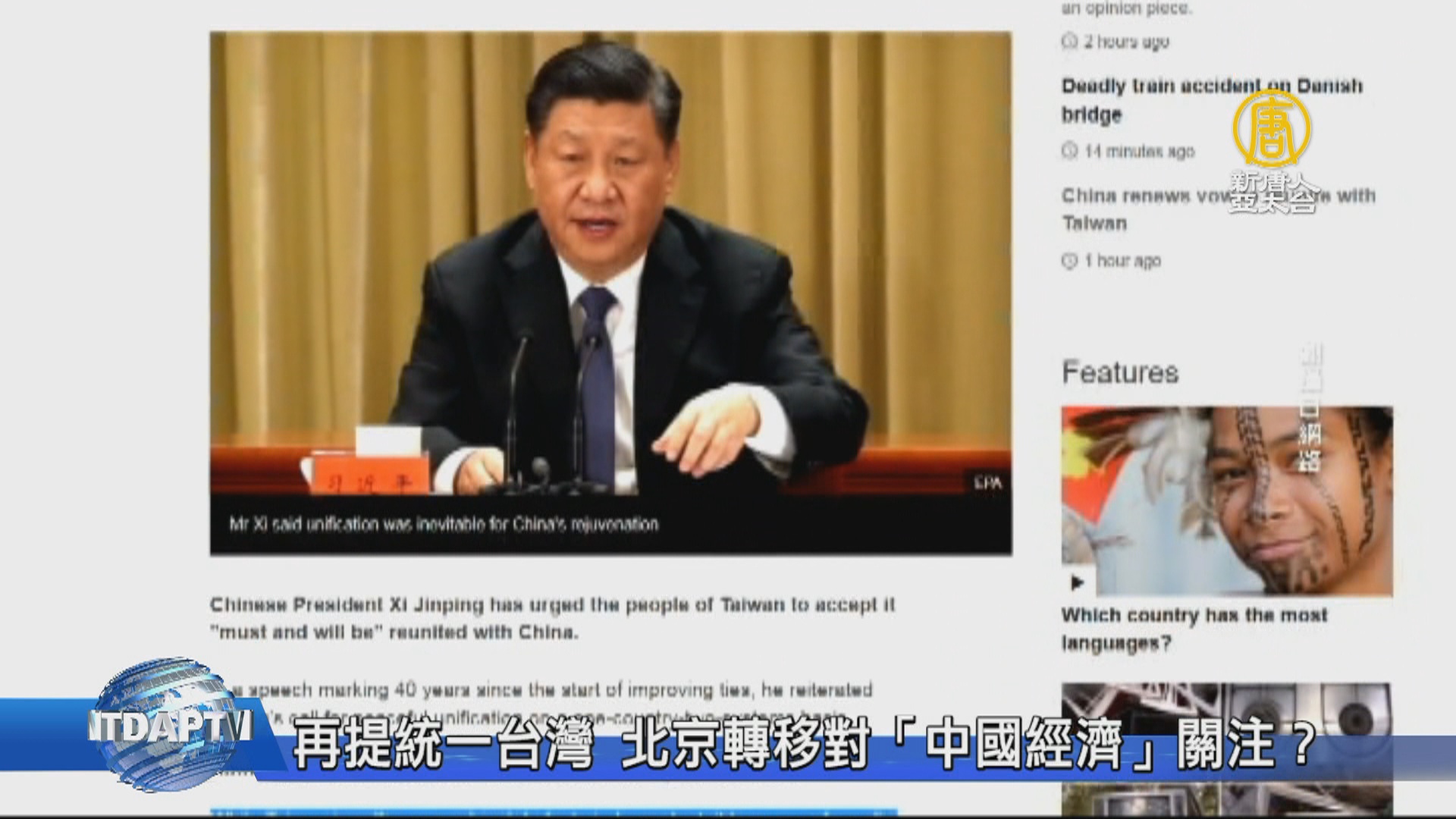 【新唐人亞太台 2019 年 01 月 02 日訊】好,中國國家主席習近平,在這個時候多次提到兩岸統一,是否要再次轉移焦點,彭博專欄作家高燦鳴質疑,這是在分散外界對中國經濟不確定性的注意力,這種做法和1990年代俄羅斯出兵車臣,如出一轍。另外日媒則解讀,這是要牽制台美互動,BBC也分析,習近平可能利用台灣的政治分歧,來實現統一。