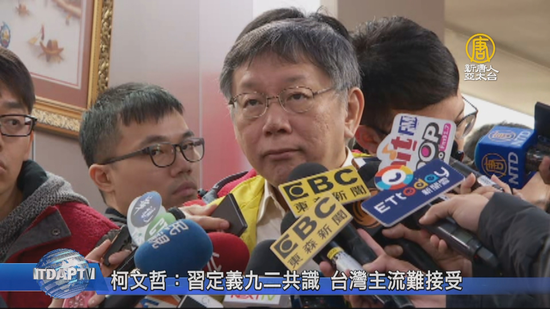 【新唐人亞太台 2019 年 01 月 03 日訊】習近平昨天發表談話,對兩岸發展提出一國兩制,重新定調九二共識。台北市長柯文哲表示,對於習近平的說法,以及九二共識的定義,台灣主流民意,無法接受。