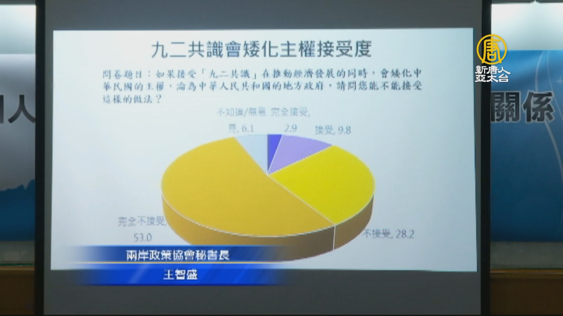 【新唐人亞太台 2019 年 01 月 03 日訊】帶您關心,去年年底大選,不少藍營政治人物,都喊出「九二共識」的口號。兩岸政策協會,對此做民調,結果顯示有大約八成民眾,不能接受 九二共識 是一個中華人民共和國原則。