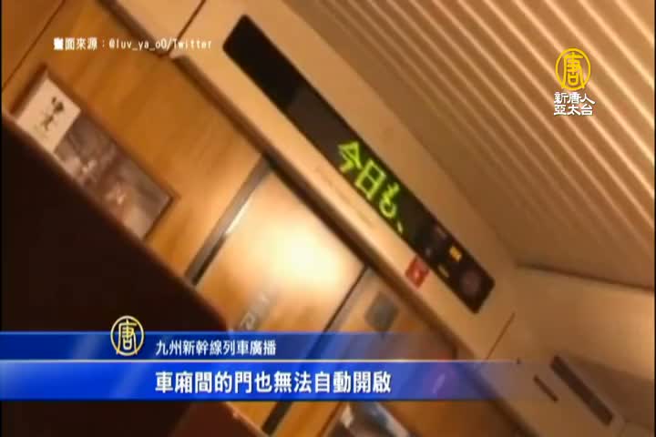 九州新幹線列車廣播:「廁所仍可使用,但無法沖水,請留意。車廂間的門也無法自動開啟,開關門請麻煩手動。」