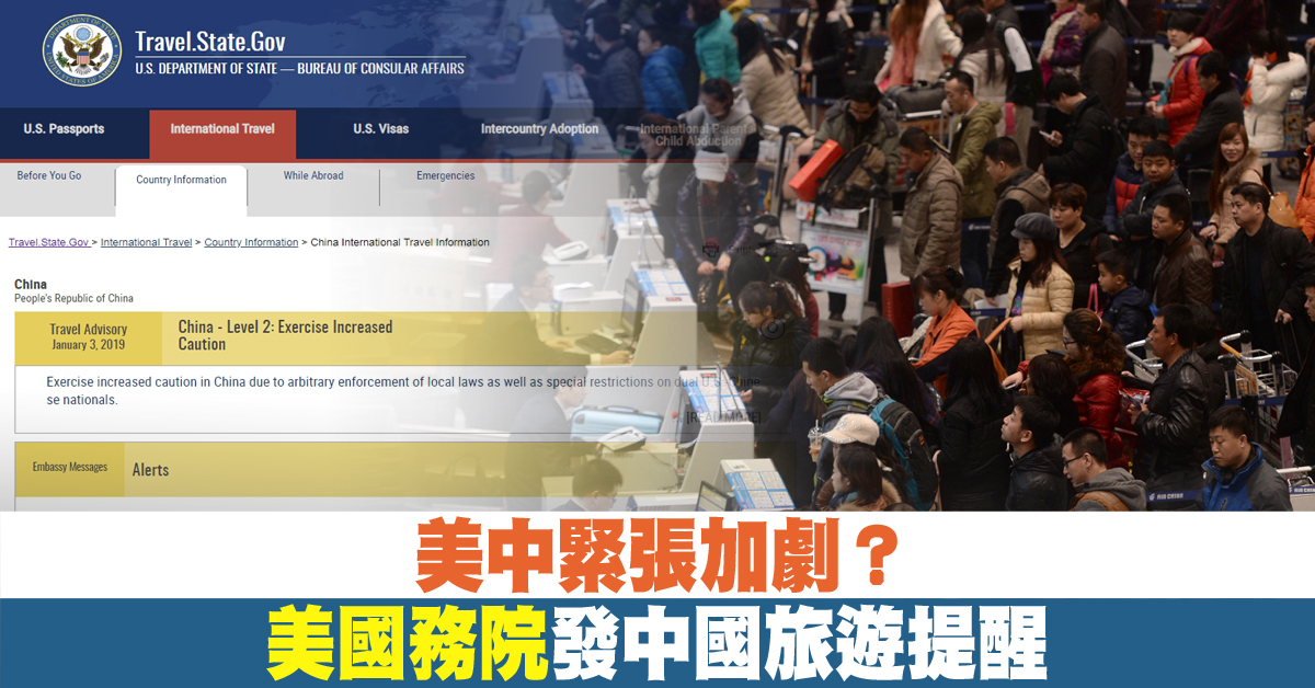 【新唐人亞太台 2019 年 01 月 04 日訊】美國國務院今天更新對中國旅遊安全建議,提醒公民前往中國旅行時,要小心中共任意執法,可能以「出境禁令」禁止美國公民離開中國,並提醒在當地謹言慎行。