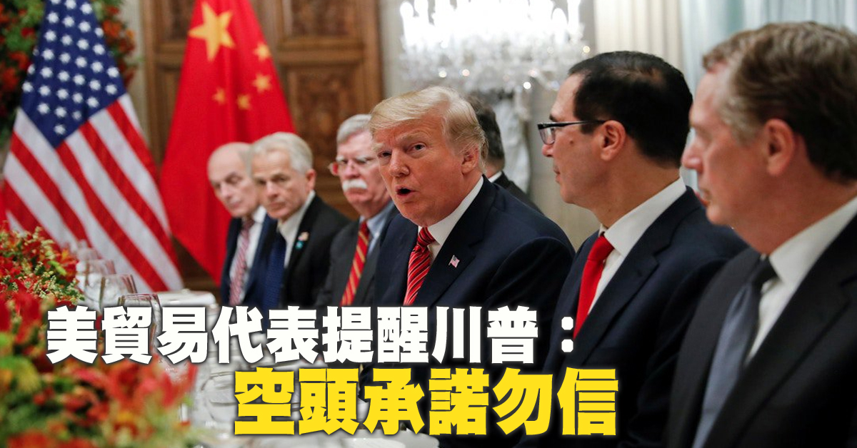 【新唐人亞太台 2019 年 01 月 05 日訊】歡迎回來。中美貿易戰90天緩衝期正一分一秒的倒數著。儘管去年川習會後,中方已經做出一些讓步,不過,在美中貿易方面有40年的經驗美國貿易代表萊特海澤提醒美國總統川普,不要接受「空頭承諾」。