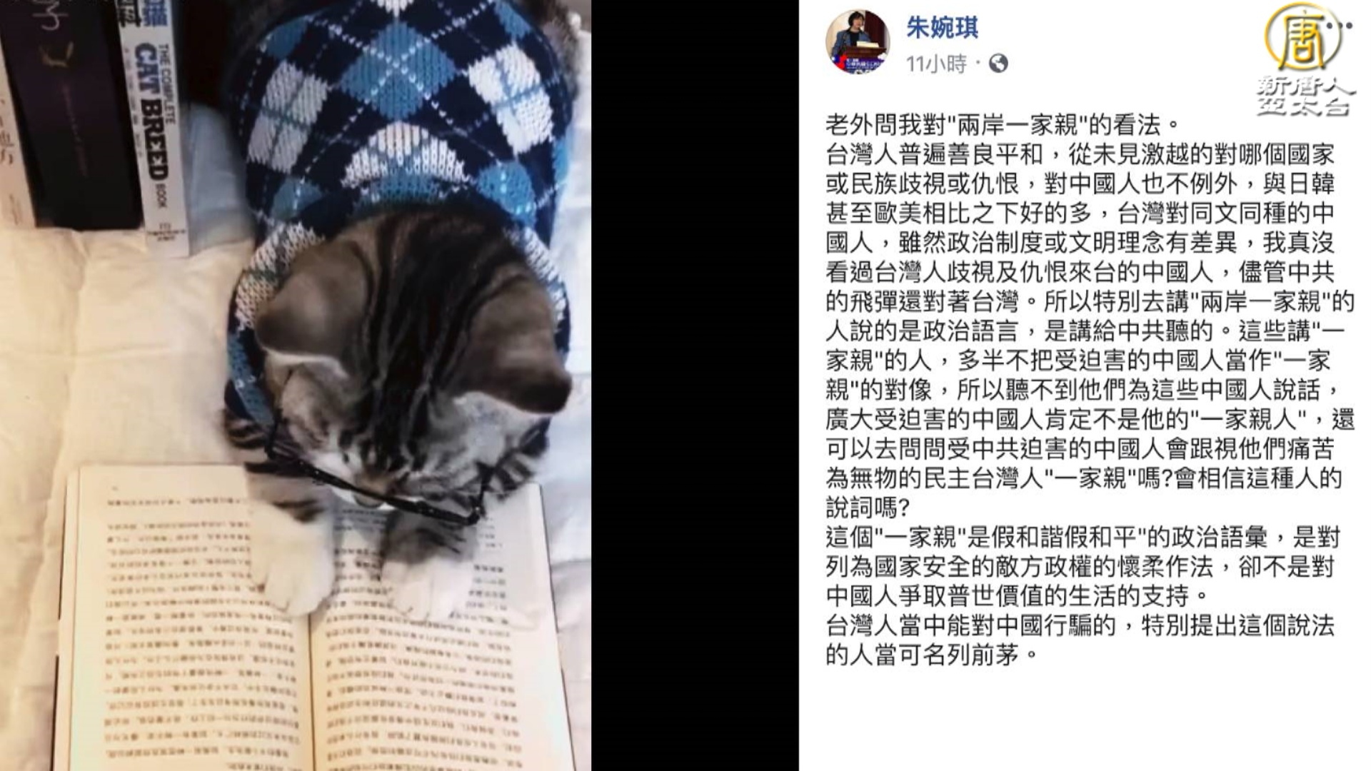 人權律師朱婉琪,週日(6日)晚間在臉書發文,談到回答外籍友人詢問她,作為臺灣人對「兩岸一家親」的看法。