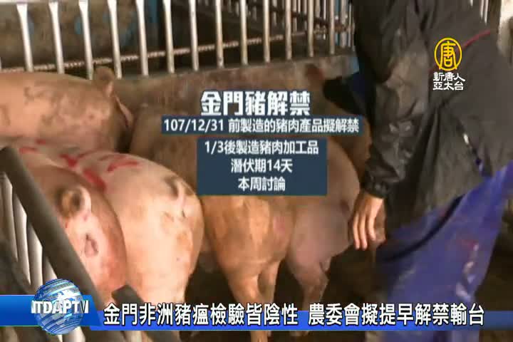 【新唐人亞太台 2019 年 01 月 07 日訊】非洲豬瘟疫情蔓延,農委會昨天大動作召開記者會宣布,未列管的1155個廚餘養豬場須先向環保單位申請檢核改以加熱廚餘餵豬,否則1周內得改用飼料或退場。而金門豬場檢驗都呈陰性、沒有感染,農委會也說今天上午會召開專家會議,研擬解禁去年底前製造豬肉產品輸台。