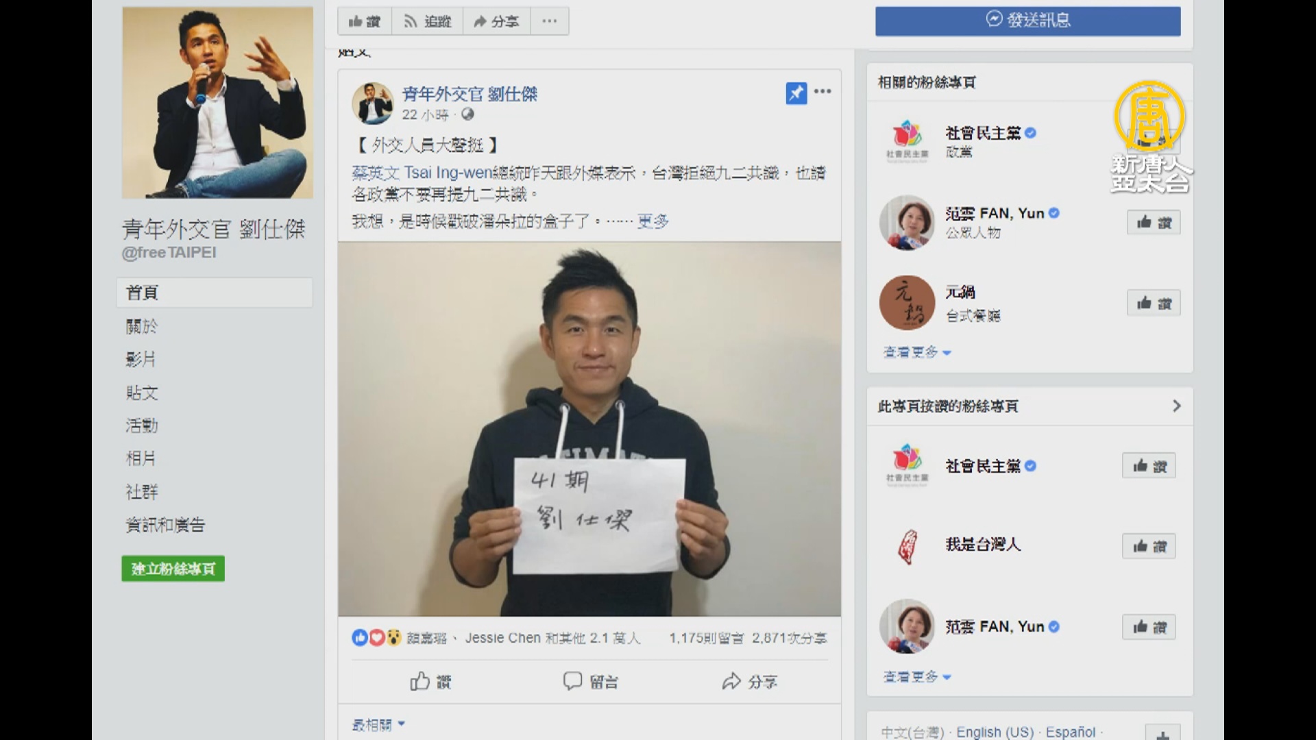 【新唐人亞太台 2019 年 01 月 07 日訊】拒絕九二共識,外交官也不沉默!曾代表社民黨參選台北市議員的劉仕傑具名發文指出,現在是戳破潘朵拉盒子的時候,他力挺蔡總統擋住九二共識,過去外交人員常有不清楚、不一致、不敢說的三個認同危機,這是非常危險的,還在外交部任職的劉仕傑說,他不怕被貼標籤,他要號召公務人員發聲力挺國家認同。
