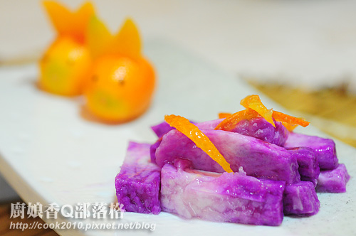 5. 金棗皮絲川燙一下,瀝乾。將紫山藥和金棗皮絲一起放入容器中,淋上糖漿即可。