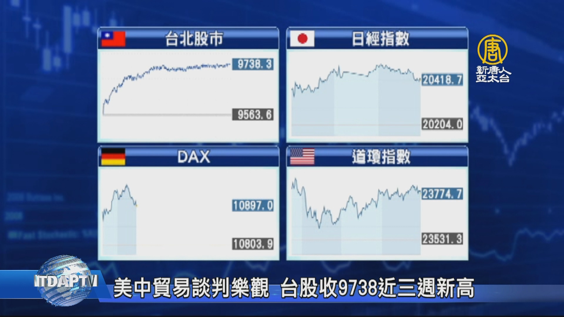【新唐人亞太台 2019 年 01 月 09 日訊】好,美國總統川普在推特表示,美中貿易談判樂觀,激勵美股收盤上揚,也帶動台股今天開盤後,一路走揚,指數開高走高,尤其是權值股發威,指數大漲超過百點,盤中連續突破9,600及9,700點關卡,終場收盤指數為9,738.31點,上漲了174.71點,成交量為1,258.92億元。