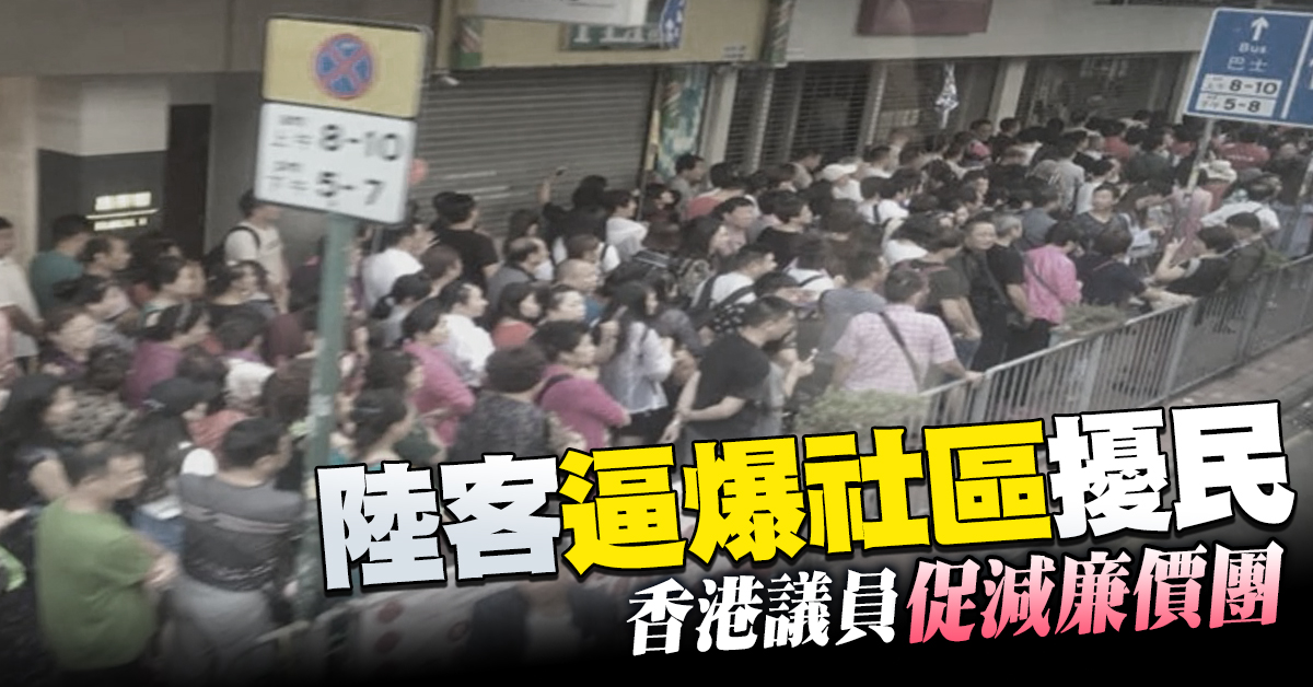 香港區議員譚凱邦:「我們在網上看到很多低價團,一百多、兩百多元一日來到香港,當然是去到珠寶店、朱古力店「?客」(交數)。這些劣質的旅行團便弄得香港烏煙瘴氣。」
