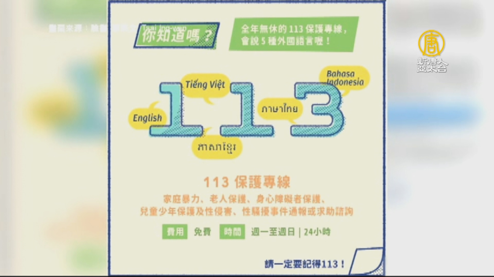 【新唐人亞太台 2019 年 01 月 15 日訊】再來關心,近來在網路引起大量討論的話題,新北市蘆洲區林姓男子,僅僅因為12歲的兒子買肉圓沒加辣,就出手毆打妻兒,影片曝光後引起民怒。有民眾甚至到林男家中,質問並出手報復。總統蔡英文昨天在臉書刊文,她刊出家暴113的免費電話通報專線,呼籲台灣民眾發揮「雞婆精神」,她說,每個孩子都是寶貝,怎麼能用暴力對待。正義感很好,可是執法工作還是讓專業的警察來。她還提到,政府的目標是,每15到20萬人口都有一個社福中心。PO文引起許多網友反饋,有人留言,身為一個家暴出生的孩子,你幫助孩子打113的成效,永比闖入他家「懲處」家暴者有用多了。不要讓孩子更不願意信任這個社會。