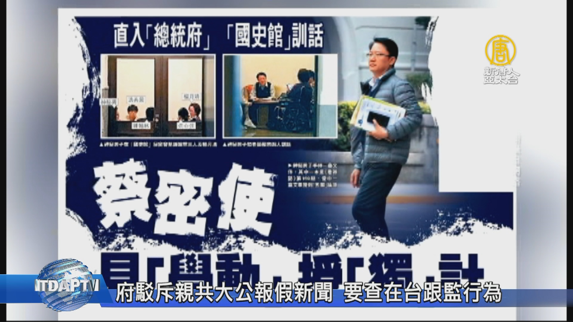 【新唐人亞太台 2019 年 01 月 17 日訊】親北京政權的香港媒體大公報,日前報導總統蔡英文派密使會港獨青年,報導中誤將台灣記者當成蔡英文密使。總統府發言人今天駁斥,這則報導是假新聞,而針對親共媒體在台跟監的行為,台灣國安單位也介入調查當中。