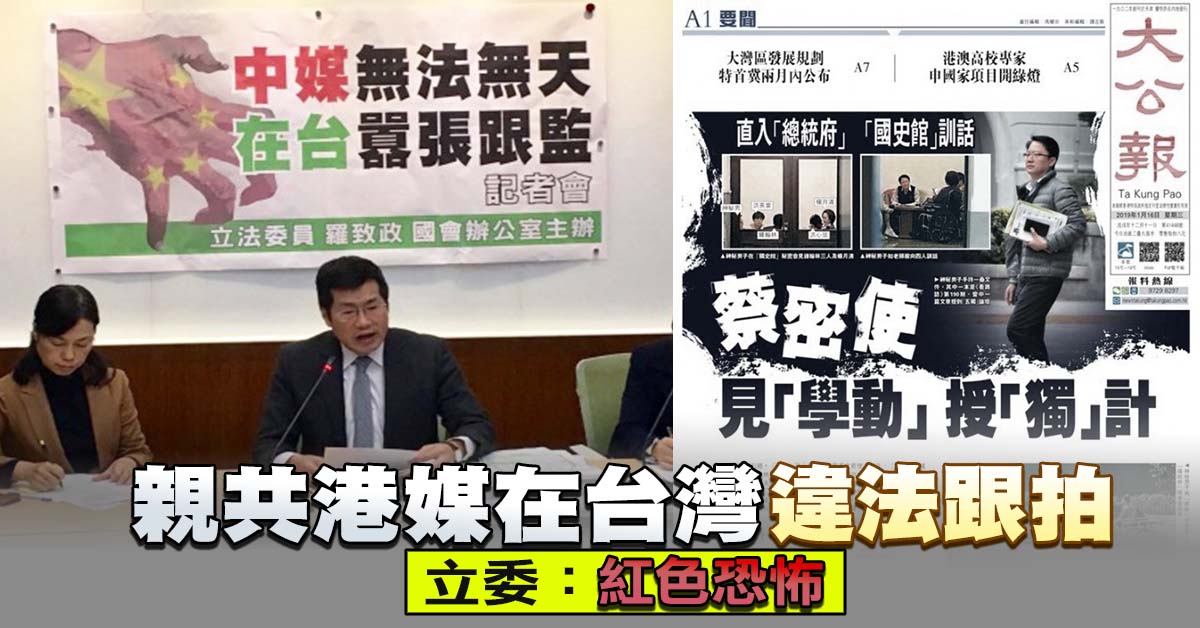 親共的香港大公報、文匯報,連日來大幅刊登港獨青年在台動態,跟拍地點遍及捷運站、書店、彩券行、還有娃娃機店。如同監控一般的跟拍,還烏龍報導蔡英文密使與港獨青年見面。總統府前一天譴責大公報捏造假新聞。而立委認為,親共媒體長驅直入,囂張跟拍,是在搞紅色恐怖。