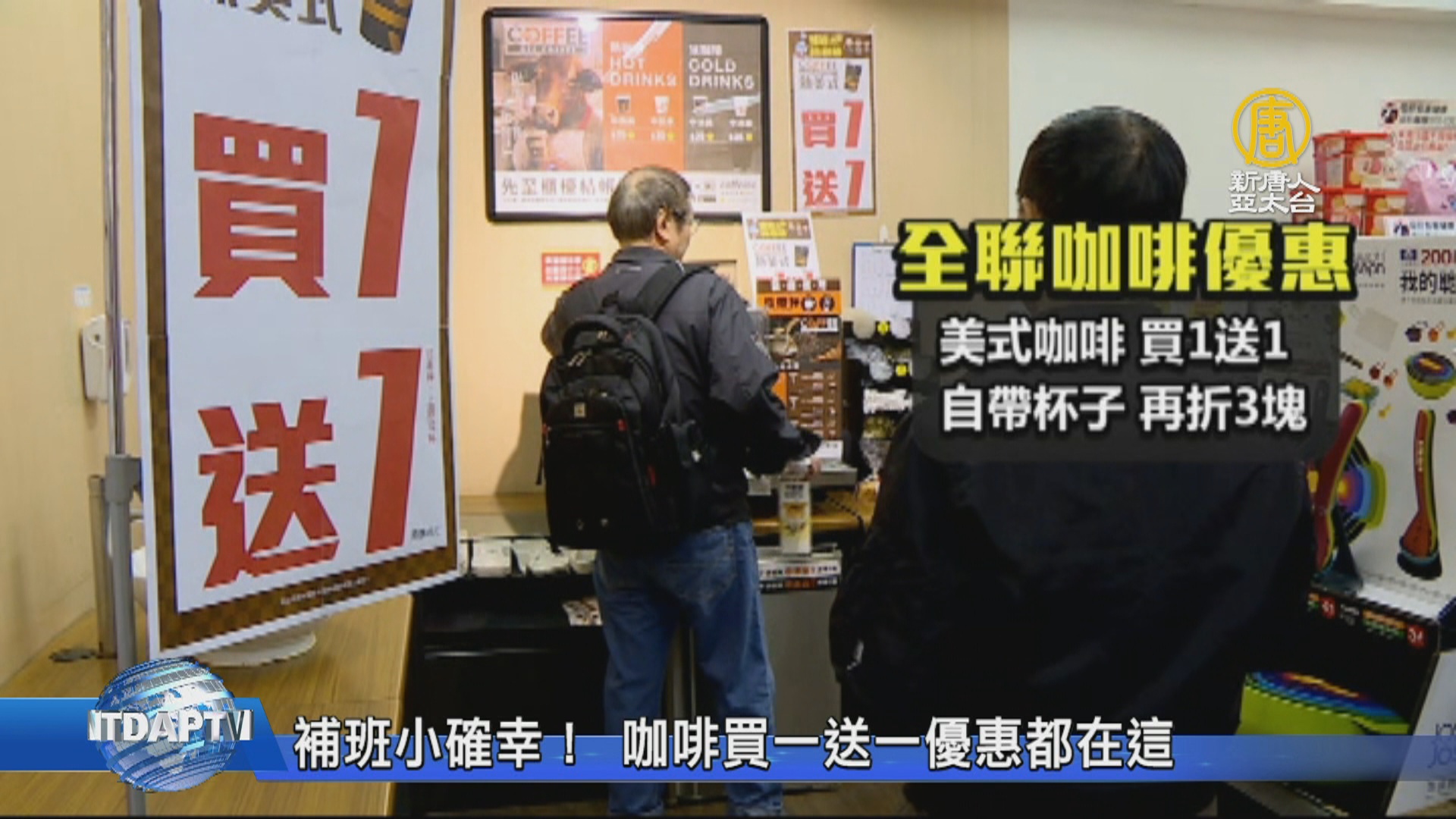 【新唐人亞太台 2019 年 01 月 19 日訊】配合過年連假,今天(19日)星期六全國補班一天,讓不少連續上六天班的民眾很鬱悶,因此多家連鎖店業者推出限時優惠,像是星巴克、西雅圖、全家便利商店、OK超商,都祭出咖啡買一送一優惠,就連超市全聯也推美式咖啡買一送一,撫慰上班族心靈。