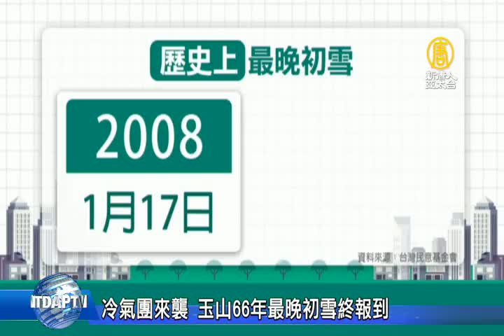 【新唐人亞太台 2019 年 01 月 21 日訊】強烈大陸冷氣團來襲,玉山今天終於下雪了,下午累積深度已經有2.6公分,今年玉山初雪來得特別晚,創下66年來最晚降雪的紀錄。氣象局說,冷空氣在星期四、星期五會減弱,但在下周日又有鋒面會來,月底北部地區最低溫可能來到12度,提醒民眾,衣服穿保暖一些。