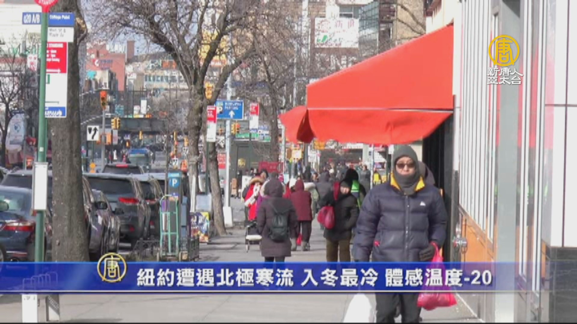 記者:「因為受到北極寒流的襲擊,在紐約市,現在的體感溫度達到攝氏的零下20度左右,提醒大家一定要做好保暖。」