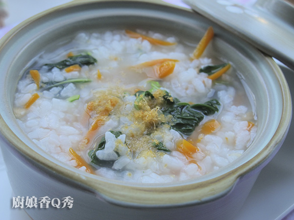 白米一杯、龍葵葉適量、紅蘿蔔半條、薑酥1匙、蘿蔔乾1大匙、蛋1個、鹽適量、麻油數滴
