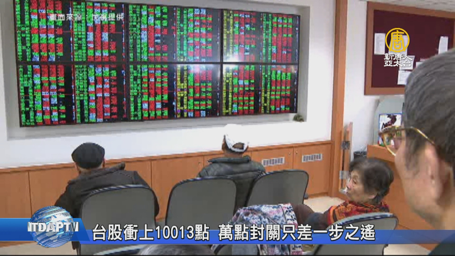 【新唐人亞太台 2019 年 01 月 28 日訊】來關心台股,股市封關倒數三天,今年能不能在萬點封關?只差一步之遙,今天台股一開盤就上漲36點,以10006點開出,而股王大立光、被動元件雙雄也氣勢如虹,終場指數衝上10013點,站回萬點,希望能讓股民在過年前收到大紅包。