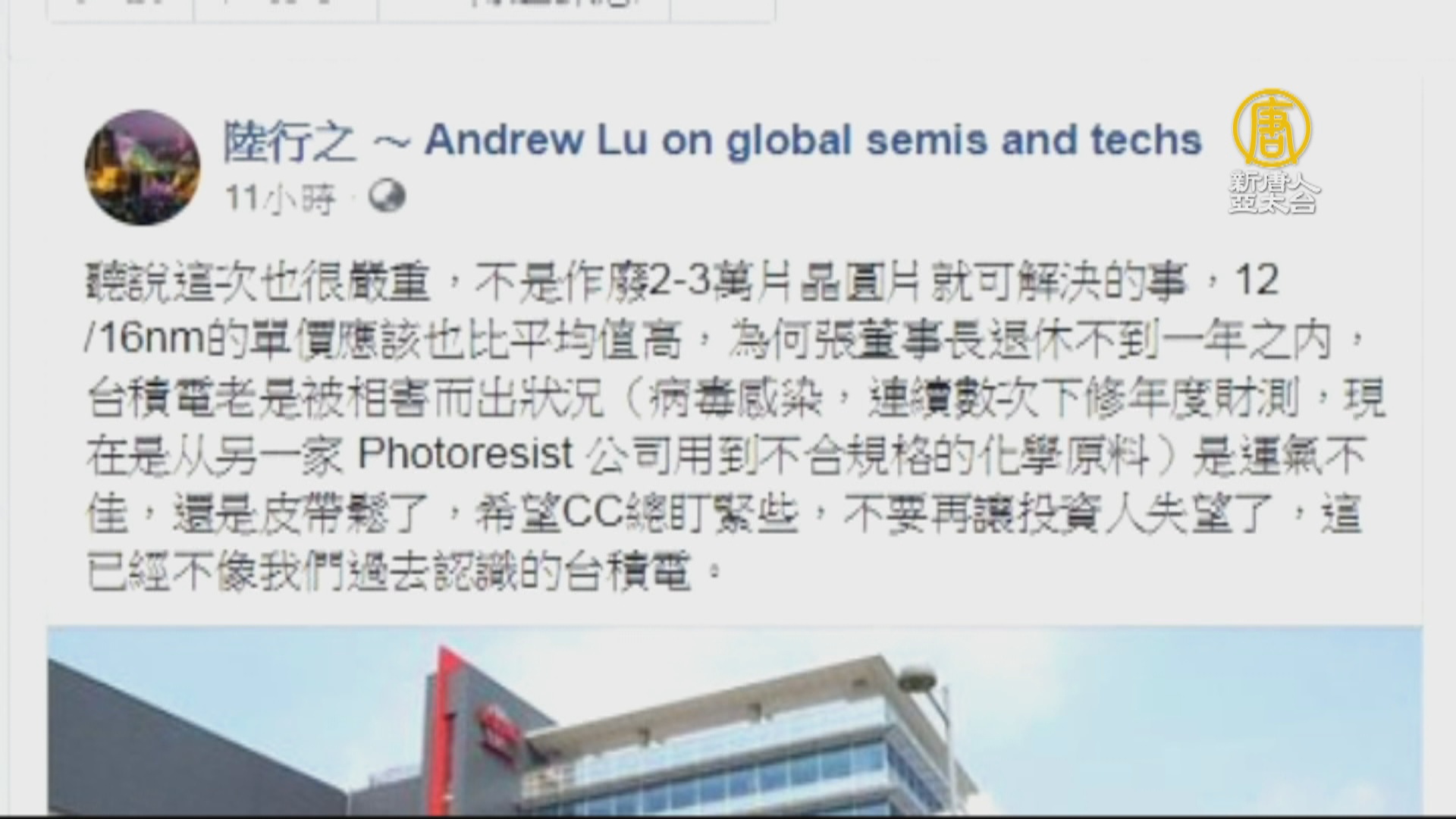 【新唐人亞太台 2019 年 01 月 29 日訊】好,台積電證實,供應商使用不合格材料導致製程出問題,知名分析師陸行之在臉書上指出,聽說這次也很嚴重,不是作廢2到3萬片晶圓片就可解決的事,他問,為何張忠謀董事長退休不到一年之內,台積電老是被相害而出狀況,包括之前病毒感染,連續數次下修年度財測,陸行之說,是運氣不佳,還是皮帶鬆了,希望不要再讓投資人失望了,這已經不像我們過去認識的台積電。