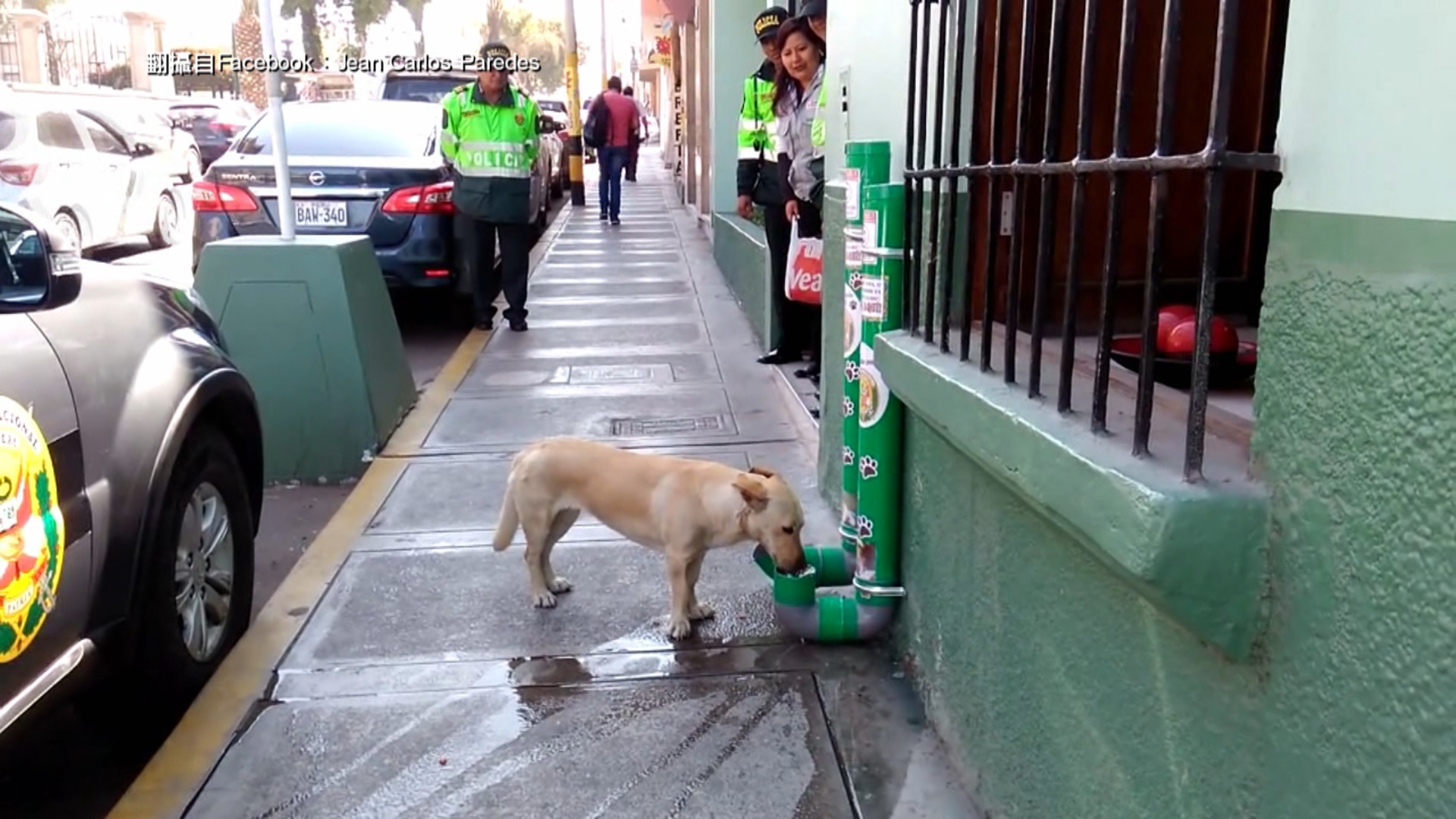 視頻中,一隻流浪的小狗正湊在祕魯南部塔克納(Tacana)市警局外面的糧筒上面大快朵頤,旁邊就是一個流出飲水的水筒。
