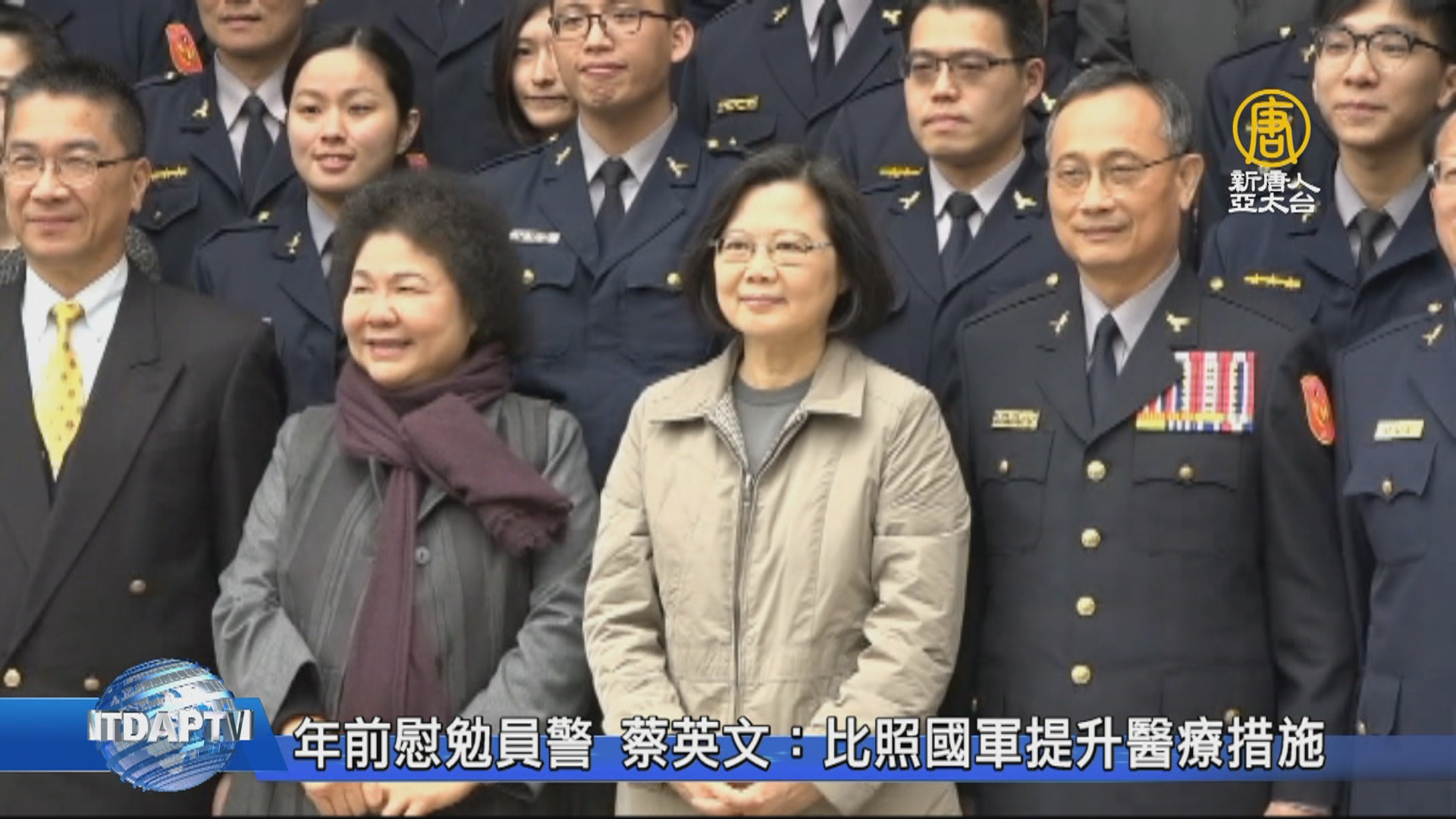 【新唐人亞太台 2019 年 02 月 01 日訊】年節將近,總統蔡英文今(1)天上午到台北市中正二分局進行慰勉,蔡英文表示除了送來加菜金,也帶來台灣人民的感謝,她也提到要提升警察醫療措施,比照現役軍人,給予應有的保障。