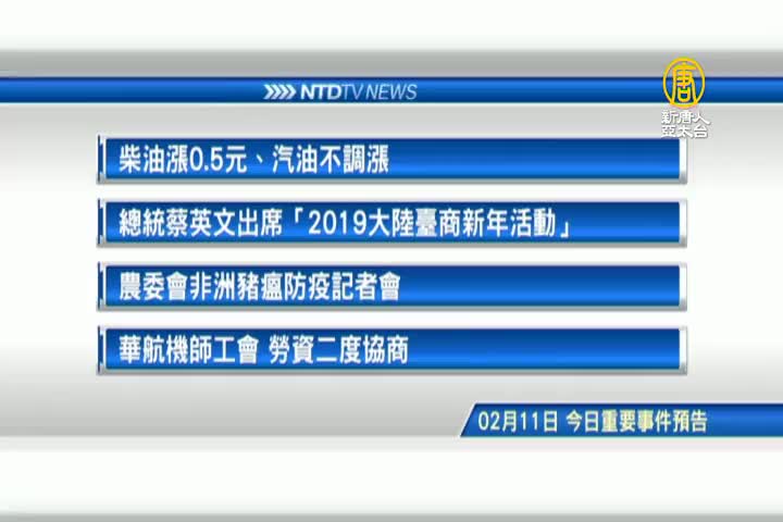 【新唐人亞太台 2019 年 02 月 11 日訊】接著帶您看到,2月11日,星期一有哪些重要活動,首先是民生消息,柴油今天凌晨零點起漲0.5元、汽油不調漲。再來是,總統蔡英文出席「2019大陸臺商新年活動」。接著看到,農委會非洲豬瘟防疫記者會。最後是,華航機師工會,今天勞資二度協商。