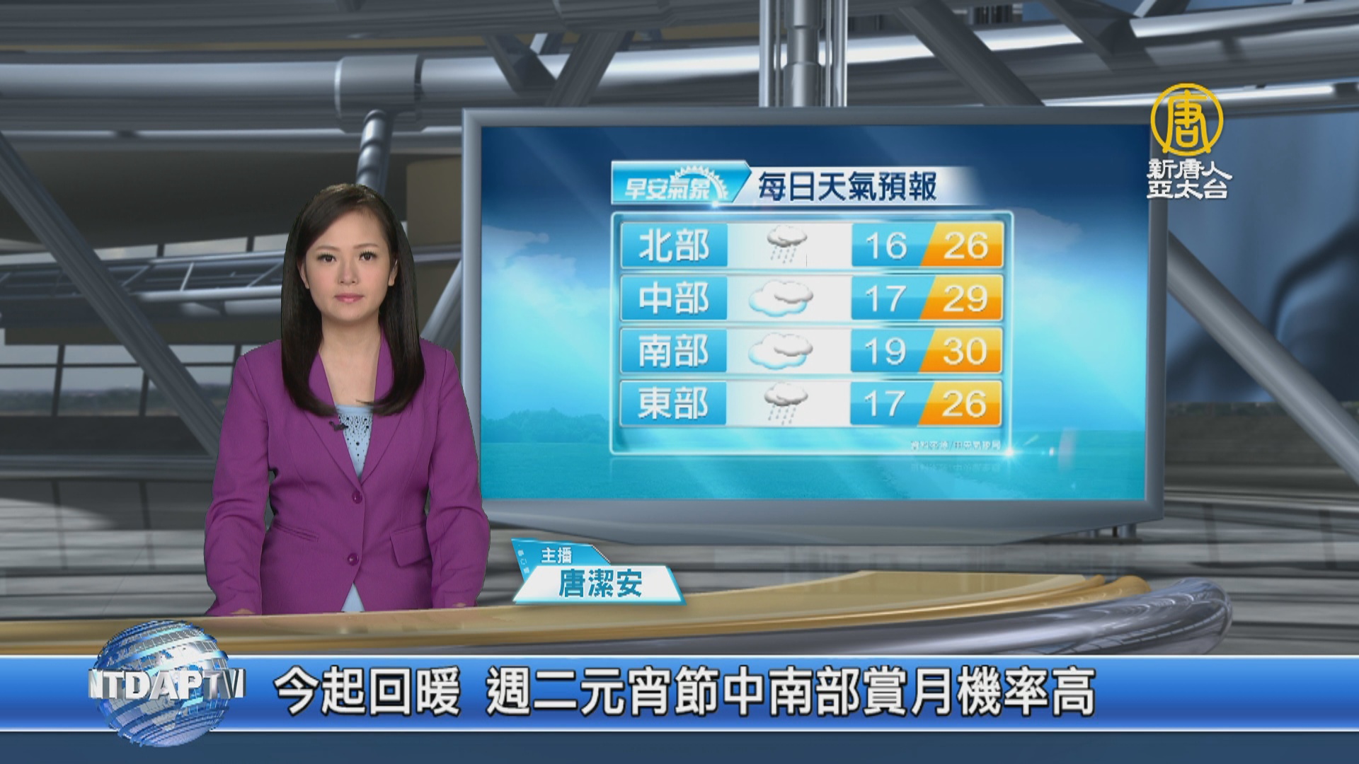 【新唐人亞太台 2019 年 02 月 18 日訊】歡迎您收看2月18日的早安新唐人,我是唐潔安,先來帶您關心今天的天氣情況。東北季風減弱,白天氣溫會逐漸回升,今天各地高溫將在26度以上,但北部和東半部,雲量較多甚至會出現有雨情況。另外,明天是元宵節,北市天文館說,這將是119年來首見的元宵最大滿月。但氣象局預測,受暖濕空氣影響,明天北部、東部賞月要碰運氣,中南部機會較高。帶您一起來看到國際媒體重要訊息。
