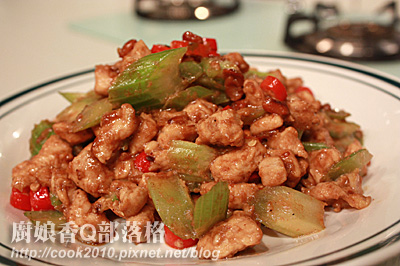 3. 倒入雞丁後翻炒,成品色美,盤中帶油。