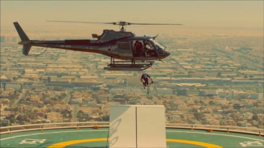 帆船飯店位於波斯灣海岸,曾是世界上最高的飯店建築,不僅風景絕美,在頂樓邊緣設有伸出式停機坪。凱爾說自己有懼高症,必須盡快離開飯店頂樓,而且直升機也無法在設有極限單車用坡道的停機坪上久留。