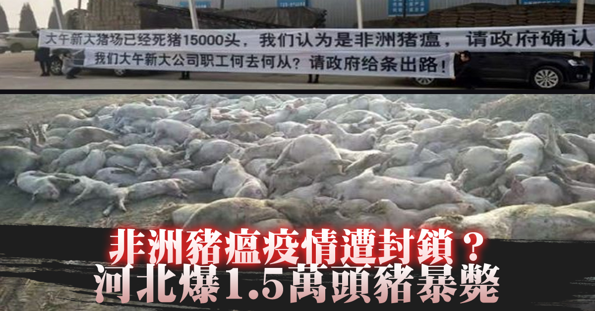 【新唐人亞太台 2019 年 02 月 23 日訊】歡迎回來。持續關心中國非洲豬瘟疫情消息,河北省保定市徐水區的一個高安全等級的大型養豬場,一個月來已有1萬5千頭豬死亡,豬場主人在微博公開豬隻死亡照片,更爆料,他們認為是非洲豬瘟,但政府不給確認,直接撲殺剩餘豬隻。還有員工拉起白布條,上頭寫著「我們認為是非洲豬瘟,請政府確認」,試圖引起關注。目前,在中國大陸只剩下新疆、西藏、河北及海南4個省區沒有疫情通報。據海外中文媒體批露,有匿名人士透露,上個月開始該區豬場染上疫情,但官員卻封鎖消息,聲稱是政治事件,甚至禁止企業和民眾上報,或洩漏疫情。報導還說,有人質疑「北京天津都有豬瘟,為什麼河北沒有?看這條新聞就懂了」。