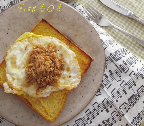 煎一個荷包蛋,放在做好的南瓜吐司上,肉鬆、蛋三明治就是我今天的中餐了