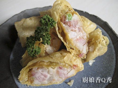 6. 豆皮平鋪,分別均勻放上肉餡捲成蝦包,再用麵糊封口。