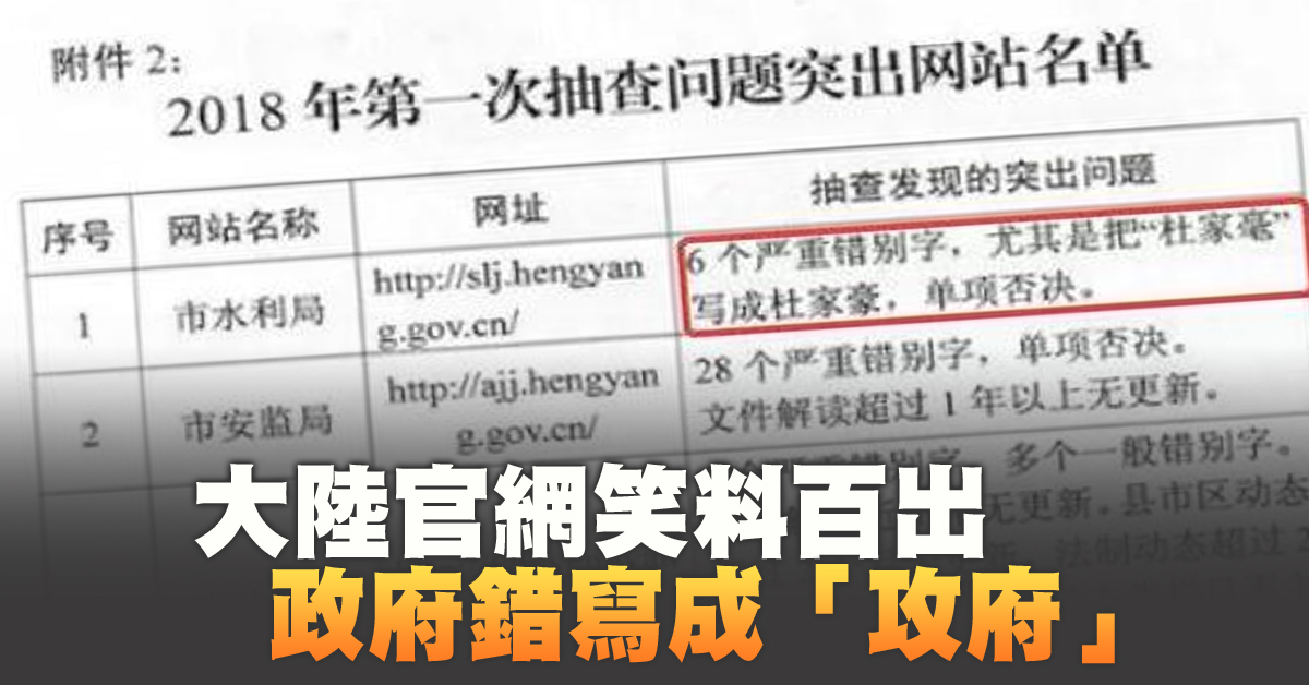 近日,中共各地方當局陸續發布2019年首季度政府網站抽查通報,曝光了很多中共政府網站嚴重錯別字現象,如政府錯寫為「攻府」,中華人民共和國錯寫為「中共人民共和國」、「中華人民大和國」等。成為笑談。