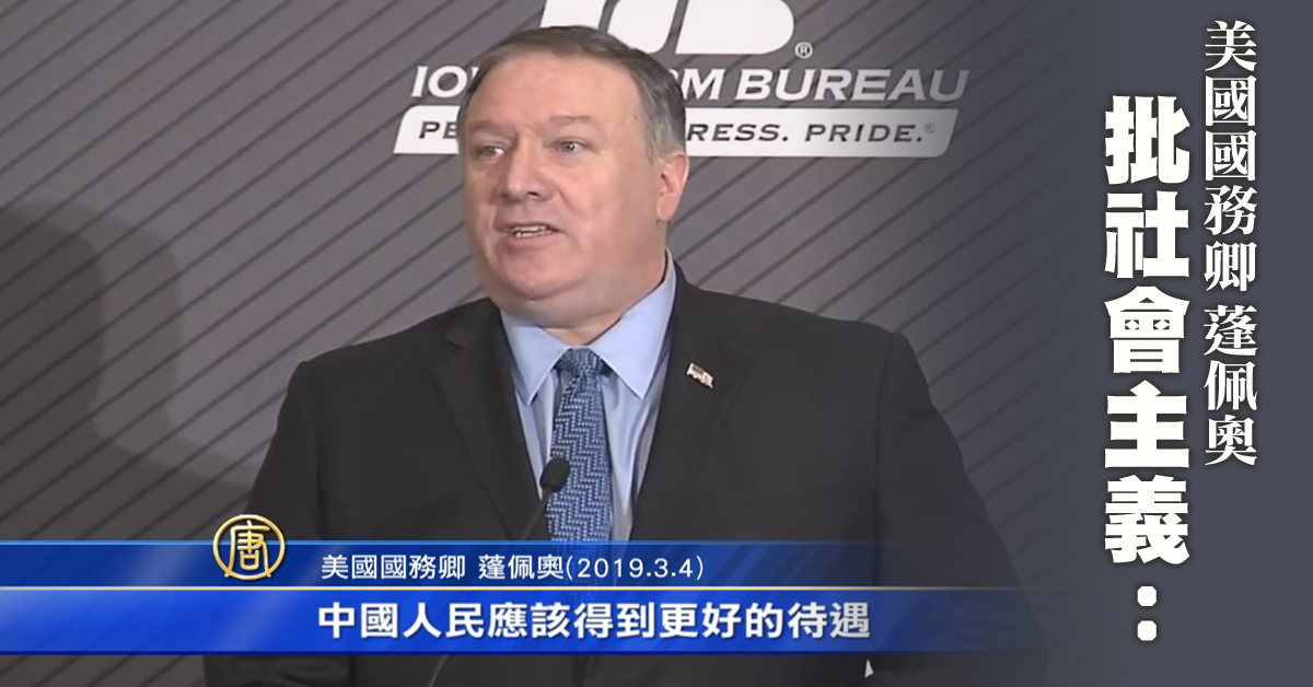 【新唐人亞太台 2019 年 03 月 06 日訊】好,接著帶您看到,美國國務卿蓬佩奧,本週一,在美國愛荷華州發表演講,他批評,中國的社會主義制度 正在導致那些被迫生活在中共政權之下的「受害者」患病和死亡。蓬佩奧在演講中強調,中國人民 「應該得到更好的待遇」。